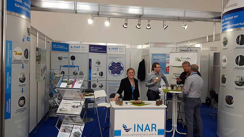 Auf dem Messestand des Netzwerks wurden die innovativen Technologien und Entwicklungslinien des INAR-Netzwerks präsentiert. Vor allem das dezentrale Klärschlammverwertungskonzept und das Konzept zur Gärrestvollaufbereitung trafen auf großes Interesse beim fachkundigen Publikum. Hinsichtlich des Klärschlammverwertungskonzeptes wurde besonders die dezentrale Monoverbrennung von getrocknetem Klärschlamm angesprochen und diskutiert. Auch das Konzept zum Phosphorrecycling traf bei den Besuchern auf große Resonanz.